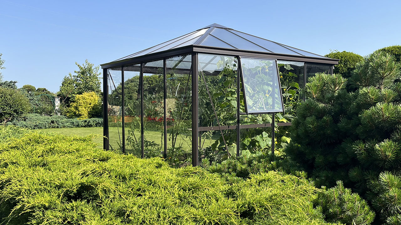 Med en helt unik kvadratisk form förstärker Tetra trädgårdens charm. Den fyrkantiga designen skapar en effektiv och rymlig interiör som förbättrar både komfort och funktionalitet. Tetra har som standard 205 cm höga sidoväggar, en dubbel skjutdörr och är försedd med sidofönster, manuellt öppnade eller som tillval med automatiska öppnare.