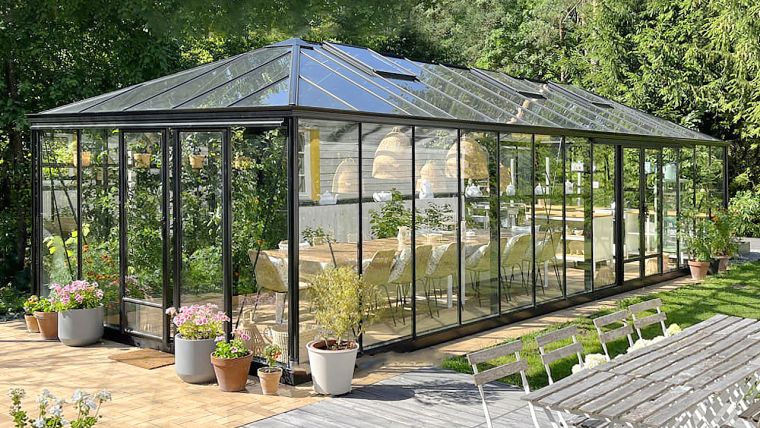 Tetra finns i tre storlekar, 9,5 m2, 14,5 m2 och 21 m2. Inte enbart ett växthus, det kan även vara ett trädgårdsrum för andra aktiviter, där det sömlöst kombinerar skönhet med praktiska egenskaper.